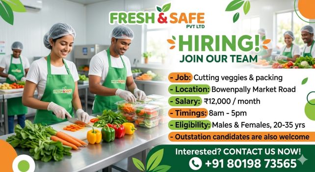 Cutting Veggies and Packing-Male / Female in Hydearabad 07/04/202607/04/2026| Cutting Veggies and Packing Location : Hyderabad Company : Fresh & Safe Pvt. Ltd. Male / Female . . . . . . . Post navigation PREVIOUS Previous post: Electricians Plumbers in Hyderabad – MedchalNEXT Next post: Warden For Boys Hostel in Khammam Related Post Captains , Executives , Stewards in Hyderabad – MedchalCaptains , Executives , Stewards in Hyderabad – Medchal Read MoreRead More Nurses in Medchal- HyderabadNurses in Medchal- Hyderabad Read MoreRead More Bell Boys For Hotel in KhammamBell Boys For Hotel in Khammam Read MoreRead More